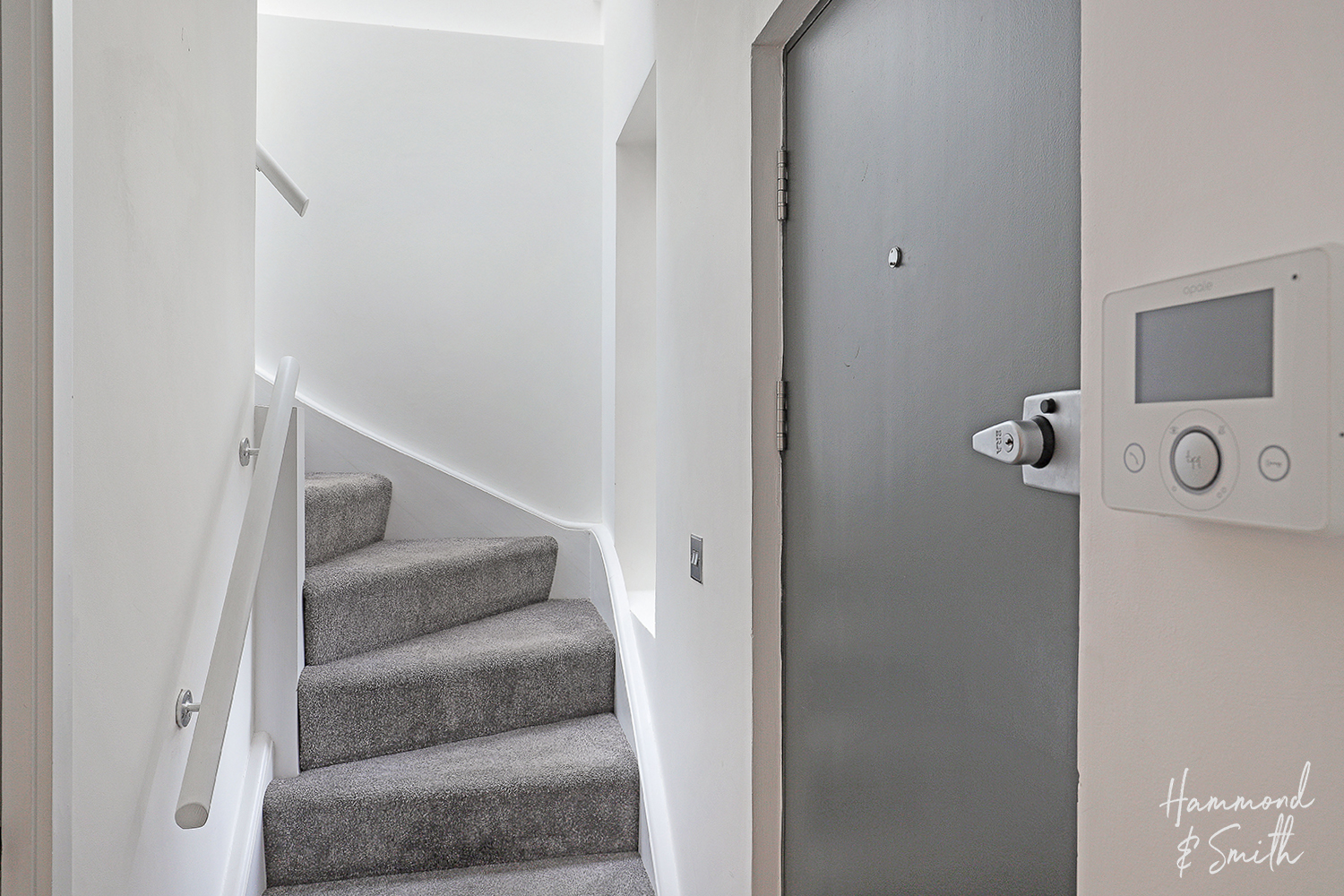Once home to a former bank, this period conversion has been lovingly transformed. Full of joy and splashes of colour, the first floor houses an open plan kitchen / living space and handy shower room. The dark grey seamless kitchen provides a beautifully blended backdrop to an impeccable living space that’s perfect for cooking, dining and entertaining, or just to simply relax. A skylit stairwell leads upstairs to two double bedrooms. The primary bedroom includes its own dressing area - complete with fitted wardrobes - and an oh-so-chic monochrome ensuite bathroom.